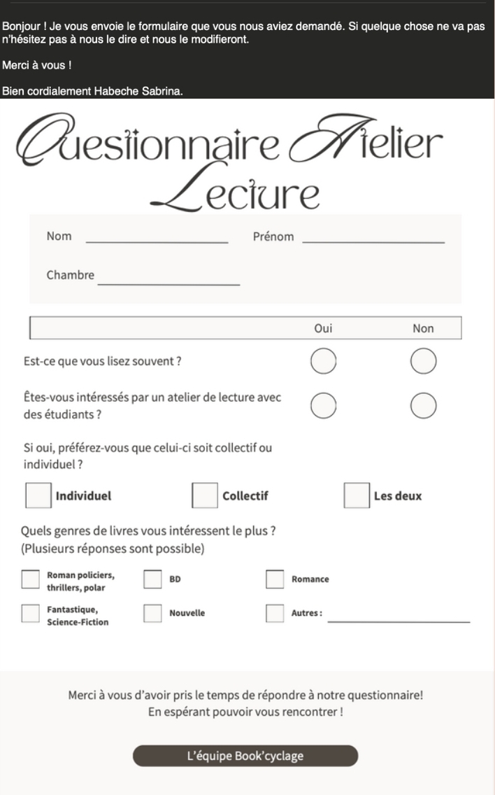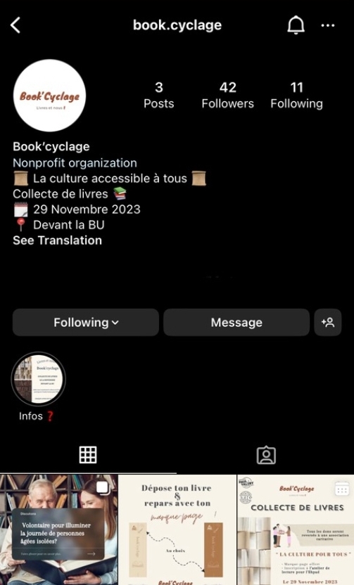 Dans le cadre du cours de conduite de projet en L2, mon équipe et moi-même avons eu l'opportunité de créer un événement de A à Z sur le thème de notre choix ! Nous nous sommes alors investies dans une collecte de livres pour la Croix-Rouge et dans le même temps, des ateliers de lecture et Ehpad pour les personnes âgées. Nous avons donc monté tout le dossier en calculant les budgets, en produisant les flyers, le compte instagram, etc.